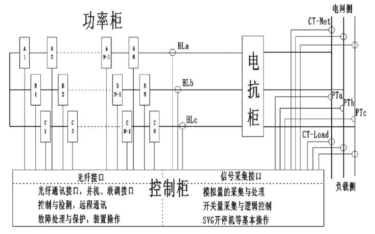 安徽中電HSVG35kv降壓式高壓動(dòng)態(tài)無功補(bǔ)償裝置由控制柜、功率柜、電抗器組成??刂乒裰饕刂葡洹⒍慰刂七壿嬰娐?,其中控制箱通過光纖連接到功率單元。在功率柜里有三相功率單元,根據(jù)電網(wǎng)電壓等級(jí)不同,每相由若干個(gè)功率單元串聯(lián)組成,最后通過電抗器接入電網(wǎng)。